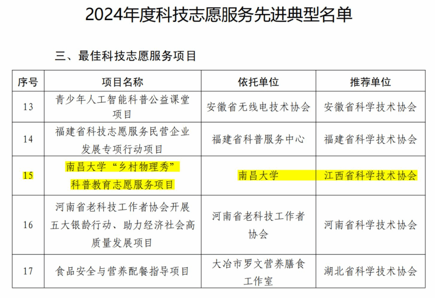 本網訊(物理與材料學院)日前,中國科協辦公廳公布了2024年度全國科技志愿服務先進典型名單,由我校物理與材料學院“星火科普”團隊實施的“鄉村物理秀”項目榮獲“最佳科技志愿服務項目”,為全國30個獲獎項目之一。這是我校多年來深耕科普教育事業,踐行公益服務的又一見證與肯定。
