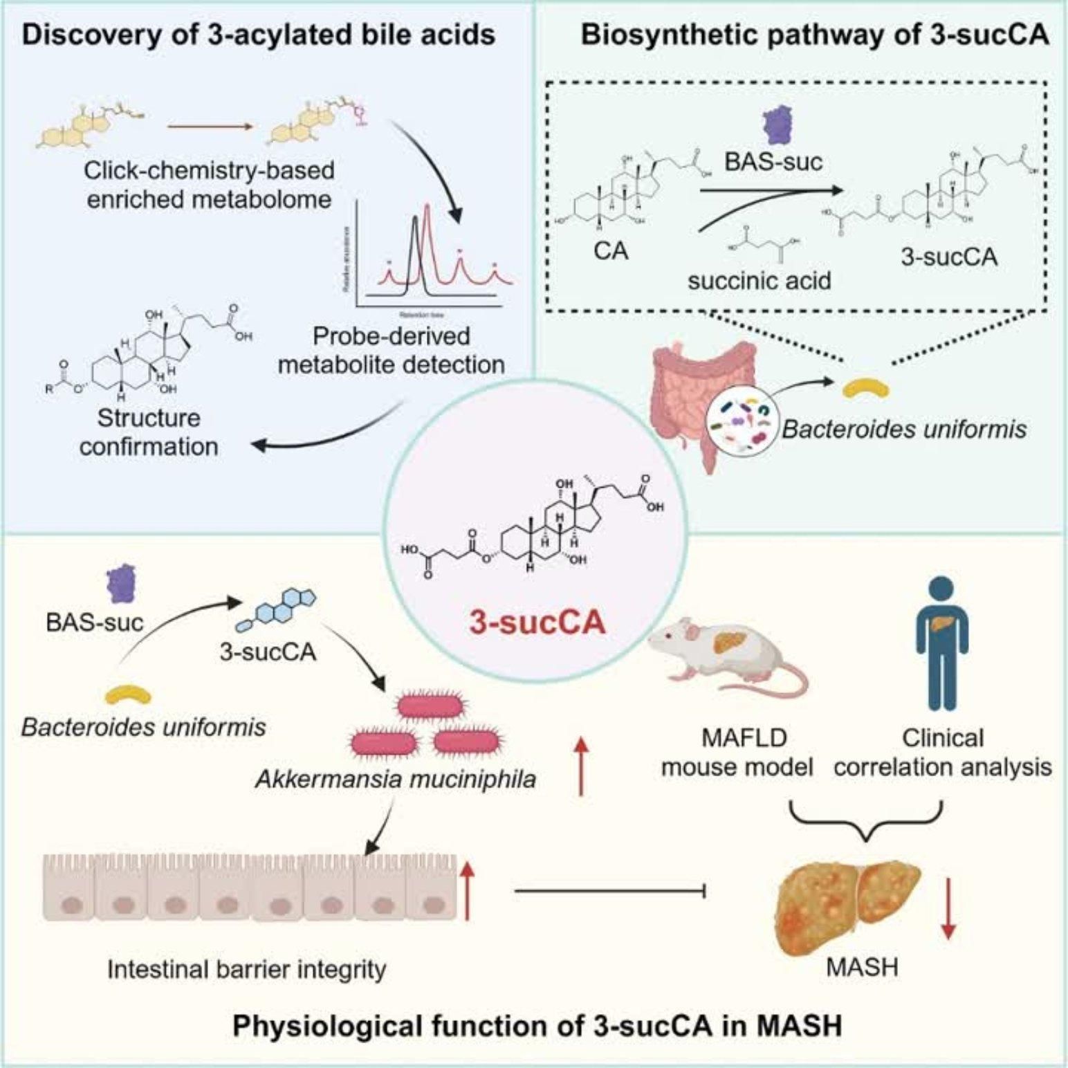 本工作構建了一種全新的菌源膽汁酸挖掘體系,并發現一類新型的酰基化膽汁酸修飾形式。在此基礎上,深入解析了3-sucCA的生物合成途徑,并闡明了其通過調控腸道A. muciniphila菌改善MASH的機制,為未來新型菌源活性代謝物的挖掘以及代謝性疾病的干預調控提供了理論指導。