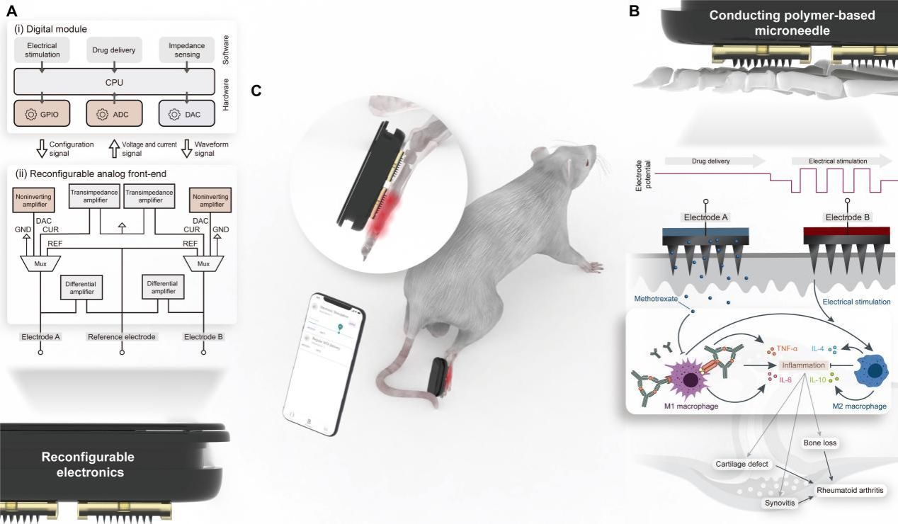 類風濕性關節炎(RA)是一種全球性的自身免疫性疾病,影響全球2450萬患者。這種疾病需要長期治療,往往預后不佳導致殘疾。甲氨蝶呤(MTX)是最常用的抗風濕藥物,但仍有許多局限性。低劑量和頻繁給藥MTX并長期監測可能會減少副作用并改善結果。為此,研究團隊開發了一種可重構集成智能設備(ISD),使用可重構的電子器件和導電聚合物微針用于RA的實時炎癥監測和協同治療。該裝置通過表現出高電容、低阻抗和適當機械特性的導電聚合物微針與皮膚建立電耦合和藥物遞送界面,以實現實時炎癥監測和按需給藥。團隊首先通過體外研究證明電刺激對巨噬細胞的抗炎作用,并揭示了其分子機制,并在嚙齒動物模型中,驗證了設備的對RA區域的阻抗傳感功能及通過機器學習模型提示炎癥狀況并促進診斷的功能,具有良好的RA診治潛力。該項工作密切協調功能材料和電子系統,以實現更全面且集成度更高的應用,使臨床多樣化和復雜的療法能夠集成到可穿戴系統中。