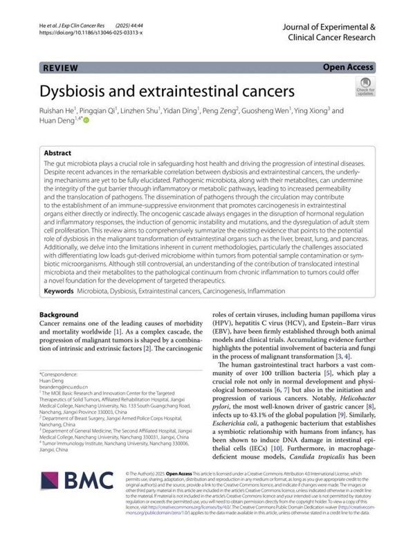 本網訊(第四附屬醫院)2月7日,我校第四附屬醫院副院長鄧歡團隊關于“菌群失調與腸外癌癥”的綜述,在線發表于國際腫瘤促進與研究協會(APSIT)會刊Journal of Experimental & Clinical Cancer Research(《實驗與臨床癌癥研究》,中科院一區TOP,IF:11.4)。“黨建+青苗計劃”學員賀睿珊為論文第一作者,教育部腫瘤醫藥基礎創新中心、南昌大學附屬康復醫院為第一通訊地址。