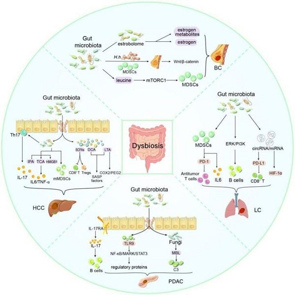 腸道菌群在維持人類健康方面發揮著至關重要的作用。近些年的研究表明,菌群失調涉及腸道外癌癥的發生和發展,但機制不明。綜述回顧了本課題組和其他研究人員近年來在該領域的研究成果、爭論的焦點問題以及未來的方向。致病微生物本身及其代謝產物可通過炎癥反應或代謝途徑破壞腸道屏障的完整性,導致病原體及代謝產物的播散。進入腸道外器官組織(乳腺、肝臟、胰腺和肺等)后,它們通過與免疫細胞、神經和間質細胞的相互作用重塑腫瘤微環境,促進實質細胞的異常增殖和分化,最終導致腫瘤的發生和進展。但對于正常菌群的定義、低載量微生物的檢測和具體作用方式,學界仍存爭議,也是未來發展的重點方向。課題組借用“外圓內方”的中國文化元素,系統描繪了病原體是如何透過腸道屏障,經過循環系統傳播至遠隔器官,并通過多種途徑直接或間接地促進腸外器官的癌變(圖2)。