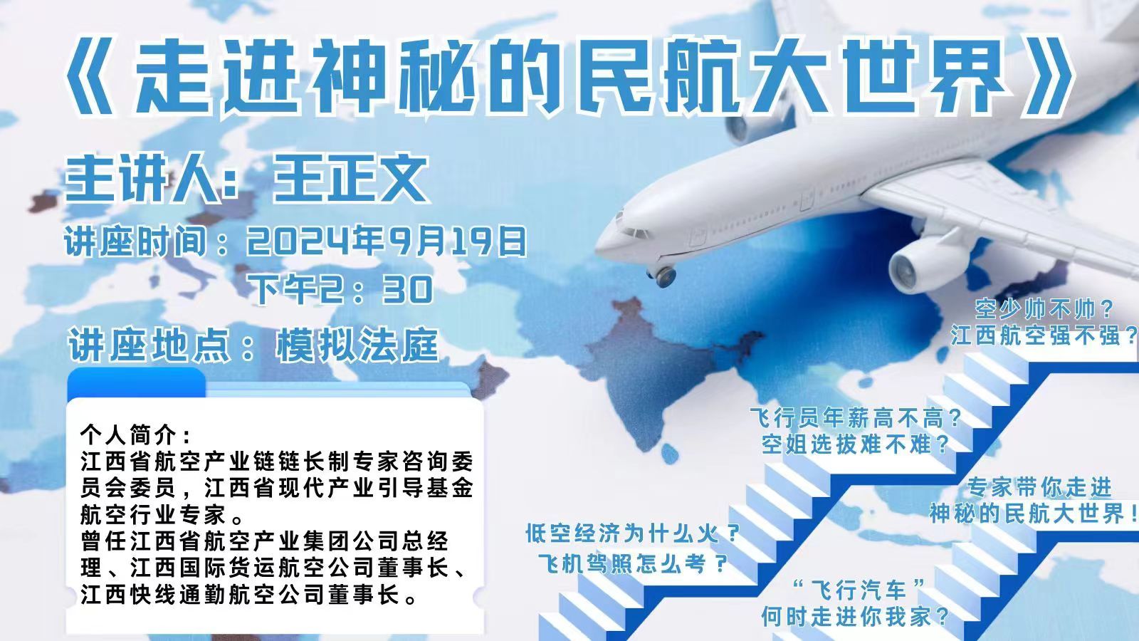 該講座多角度、全方面向同學們介紹民航大家庭,科普運輸航空與通用航空的不同之處,解答如何考取飛機駕駛執照,講解航空公司、飛機、飛行從業人員等相關行業知識,介紹低空經濟,講述江西省航空簡史,為同學們揭開民航的神秘面紗。